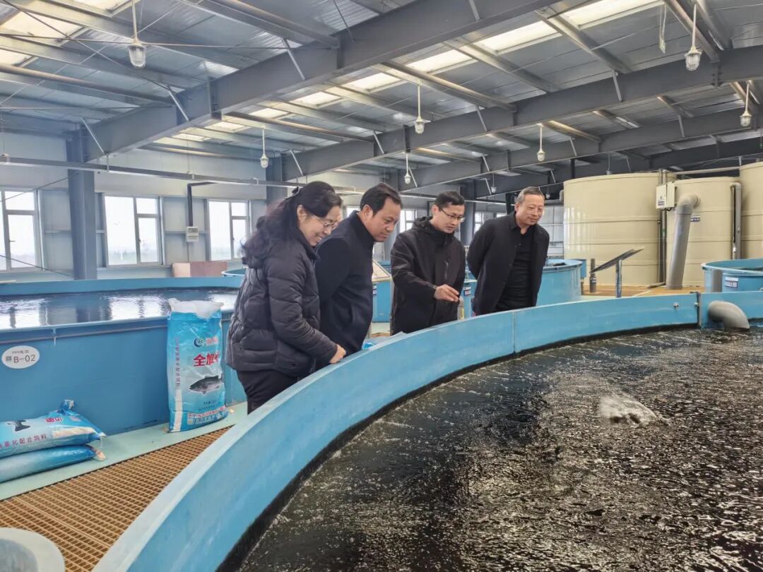 在高垅乡水产分部,钟有林一行先后走进工厂化循环水养殖车间、池塘养殖试验区和鄱阳湖水生生物科教馆,了解水产分部整体运行、彭泽鲫新品种选育攻关、刀鲚人工繁养殖试验进展、加州鲈养殖管理以及陆基设施渔业发展现状等工作。